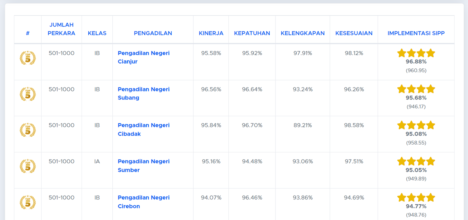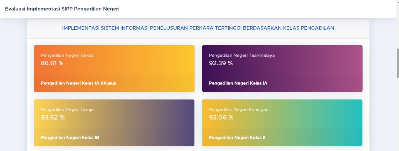 Evaluasi Implementasi SIPP (EIS) Versi 3 Pengadilan Negeri Cianjur berhasil menduduki peringkat ke-1 Wilayah Pengadilan Tinggi Jawa Barat dengan nilai 93.62% (890.43) (periode 1 Juli sampai dengan per 12 Juli 2024).