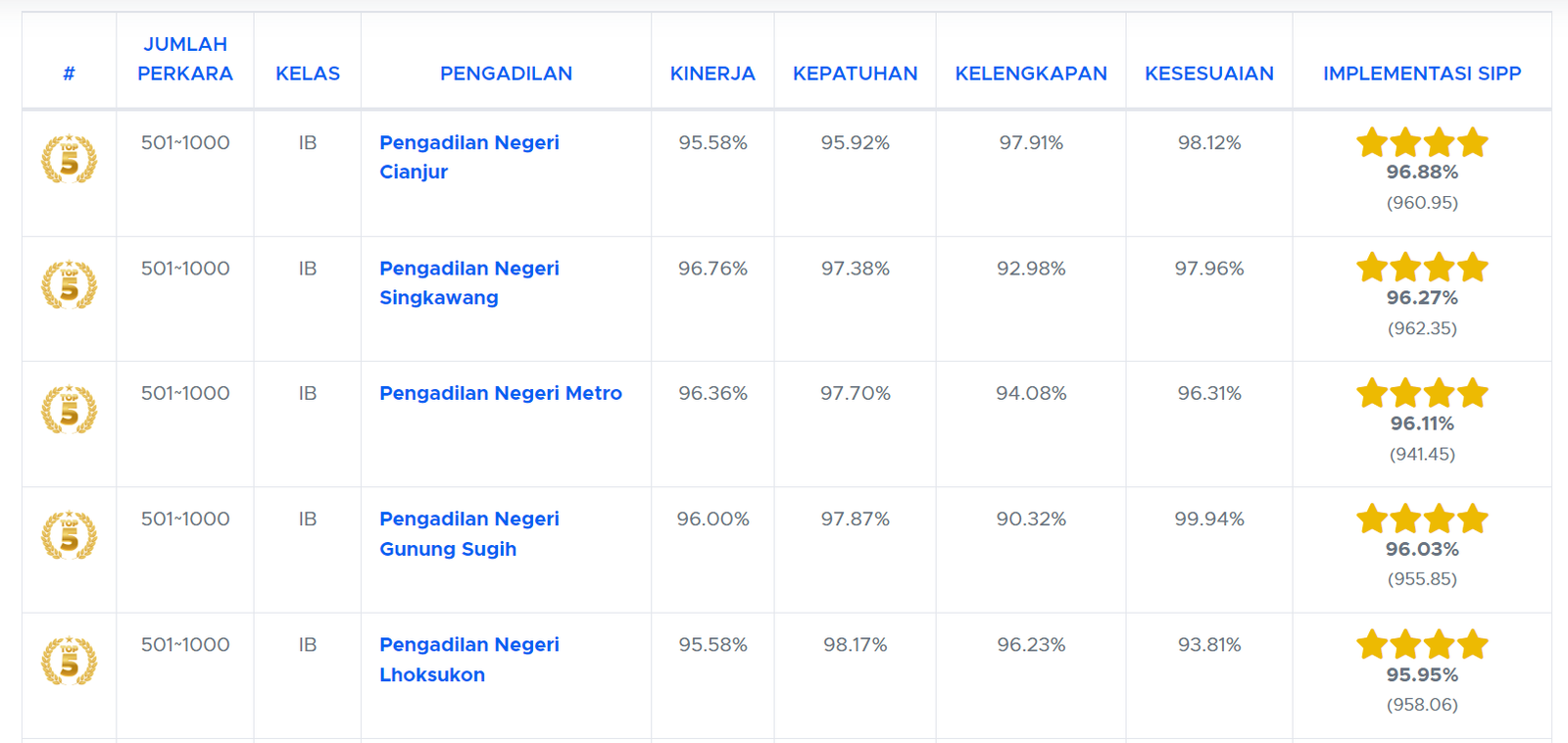 Gambar 2 - Peringkat ke-1 Nasional dengan nilai 96.88% (Kategori Pengadilan Kelas IB)