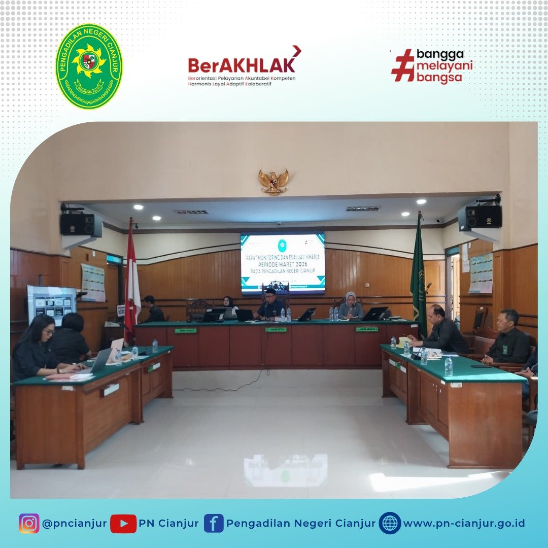 Telah dilaksanakan rapat evaluasi kinerja Periode Bulan Maret 2026 pada Pengadilan Negeri Cianjur pada Hari Selasa 31 Maret 2026, yang diikuti oleh seluruh Hakim dan aparatur beserta PPNPN dan Pegawai OS. Rapat dipimpin oleh Ketua Pengadilan Negeri Cianjur, Bapak Rudita Setya Hermawan, S.H., M.H.